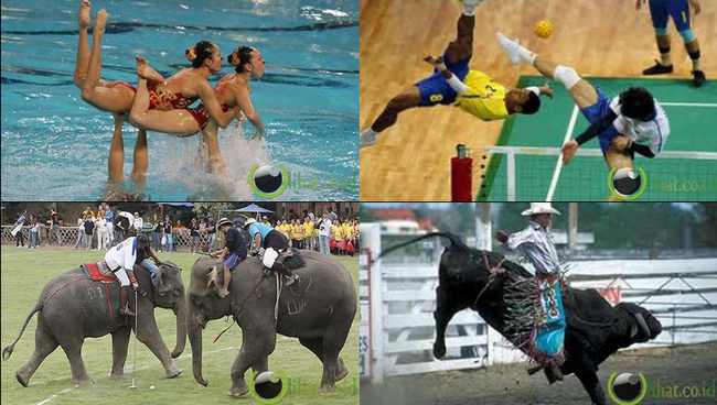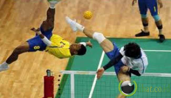 [lihat.co.id] - Sepak takraw mengombinasikan voli dan sepak bola. Peserta mencetak nilai dengan tendangan di atas kepala ke lapangan lawan. Satu tim terdiri dari tiga orang,