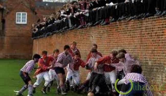 [lihat.co.id] - Sepak bola tembok adalah permainan ultra kompetitif yang diadakan di sekolah terkenal Inggris, Eaton. Lapangan sepak bola ini selebar 5 meter dan sepanjang 110 meter,