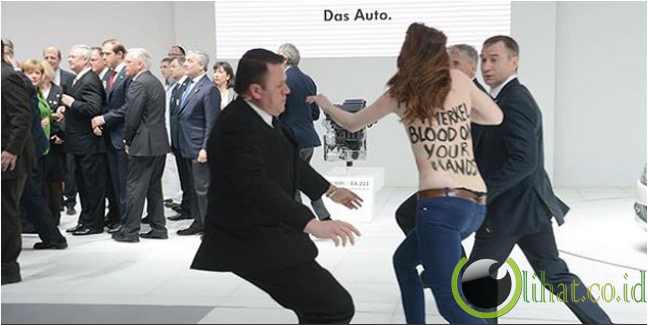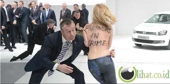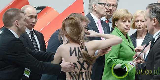 [lihat.co.id] - Salah satu wanita secara tiba-tiba berlari menerobos penjagaan Presiden Vladimir Putin. Dengan bertelanjang dada mereka melontarkan aksi protesnya