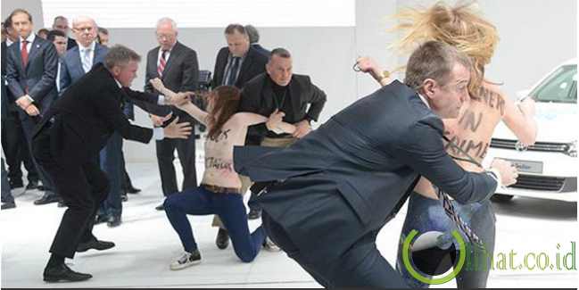 [lihat.co.id] - Empat wanita dengan bertelanjang dada tiba-tiba menerobos untuk berunjuk rasa di depan Presiden Rusia, Vladimir Putin. Mereka melontarkan protes serta meneriakkan kata-kata kasar terhadap Putin.